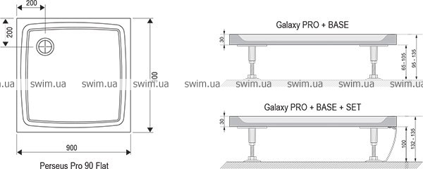Поддоны серии Galaxy PRO можно устанавливать в бетонный каркас (например, при установке поддона в пол) и применение набора ножек (BASE) в таком случае не обязательно. Для установки поддонов серии Galaxy PRO на пол ванной комнаты необходимо использовать набор ножек (Galaxy PRO BASE) и по желанию переднюю панель с крючками (SET).