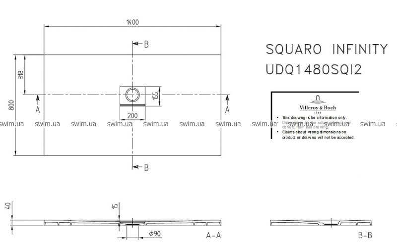 Поддон душевой Villeroy&Boch Squaro Infinity UDQ1480SQI2V-2S