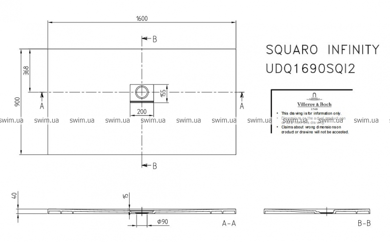 Поддон душевой Villeroy&Boch Squaro Infinity UDQ1690SQI2V-4S