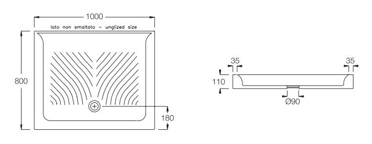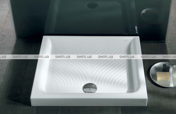Прямоугольный керамический душевой поддон со сливным отверстием 90 мм и съемным гидрозатвором, удобный в обслуживании. Крышка выпуска – круглая хромированная. Монтируется в пол. При установке сток располагается в противополжном от стены углу, борт без эмали на стороне, противоположной стоку.