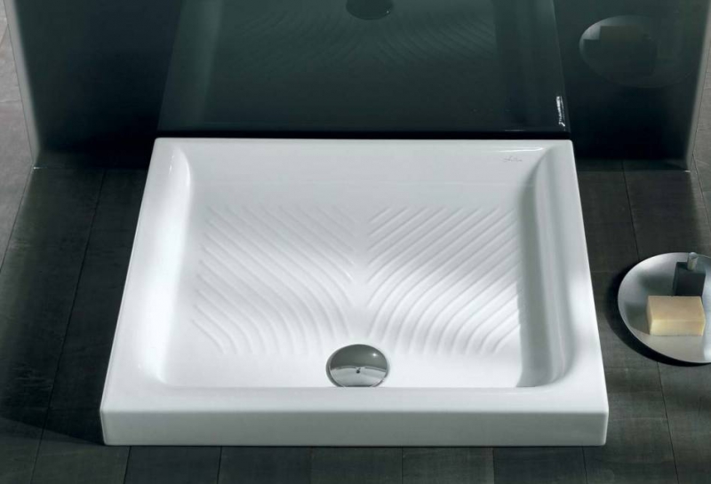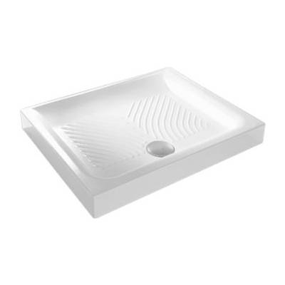 Прямоугольный керамический душевой поддон со сливным отверстием 90 мм и съемным гидрозатвором, удобный в обслуживании. Крышка выпуска – круглая хромированная. Монтируется в пол. При установке сток располагается в противополжном от стены углу, борт без эмали на стороне, противоположной стоку.