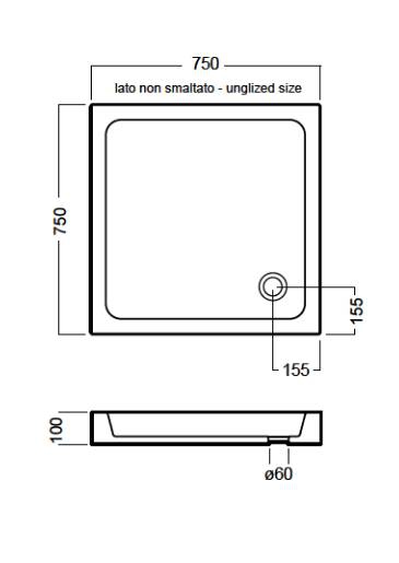Душовий керамічний піддон квадратної форми, висота борту 100 мм, без зливної арматури. Отвір зливу 60 мм.