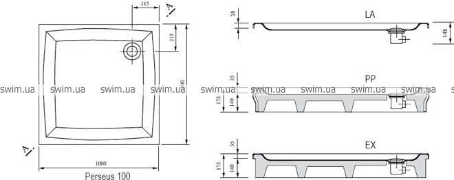 Поддоны типа LА состоят из акрилового листа (РММА+ABS) и укреплены слоем стекловолокна. Поддоны типа LА предназначены для установки в пол или на ножки. Для простой установки к поддонам поставляются универсальные ножки — BASE. Поддоны поставляются без панели.