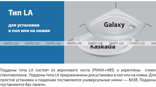 Поддоны типа LА состоят из акрилового листа (РММА+ABS) и укреплены слоем стекловолокна. Поддоны типа LА предназначены для установки в пол или на ножки. Для простой установки к поддонам поставляются универсальные ножки — BASE. Поддоны поставляются без панели.