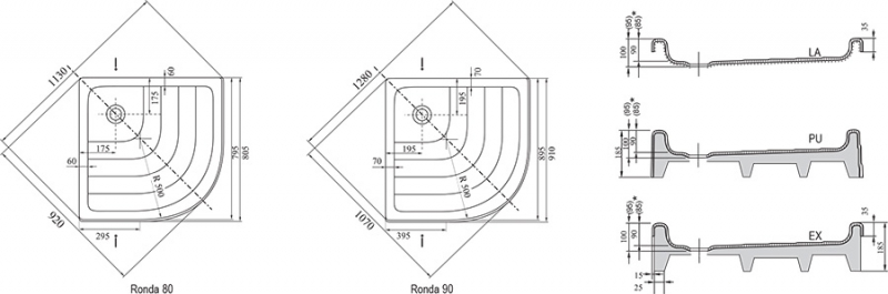 Эти поддоны устанавливаются на ножки, на пол или непосредственно в пол. Тип ЕХ подходит для облицовки кафелем.