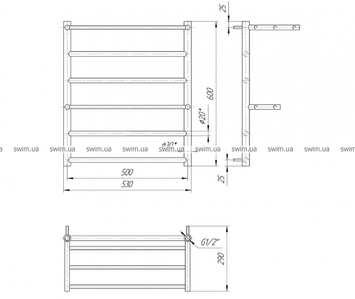 Водяной полотенцесушитель Анкона 600х500 с межосевым расстоянием для подключения 500 мм, диаметр подключения G 1/2'' состоит из 6 ребер. Полотенцесушитель Анкона производственного предприятия Mario изготовлен из нержавеющей стали АІSI 304 может быть оборудован 300W электрическим теном.