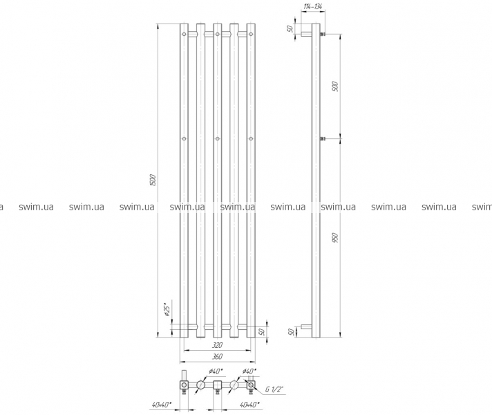 Водяной полотенцесушитель Битуб 1500x360 с межосевым расстоянием для подключения 320 мм, диаметр подключения G 1/2'' состоит из 5 ребер. Дизайн-радиатор Битуб производственного предприятия Mario изготовлен из нержавеющей стали АІSI 304 может быть оборудован 600W электрическим теном.