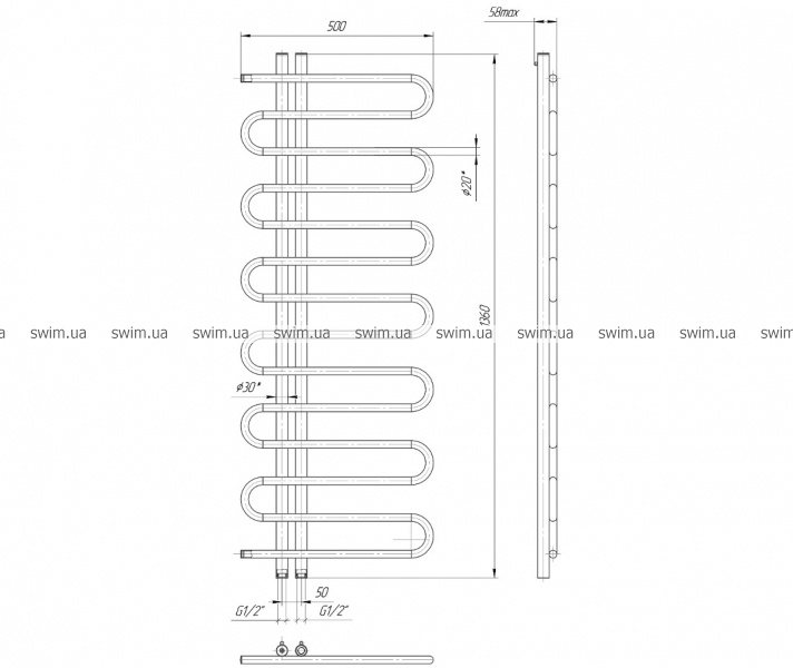 Водяной полотенцесушитель Евро Снейк 1360x500 с межосевым расстоянием для подключения 50 мм, диаметр подключения G 1/2'' состоит из 13 гибов ребер. Полотенцесушитель Евро Снейк производственного предприятия Mario изготовлен из нержавеющей стали АІSI 304 может быть оборудован 600W электрическим теном.
