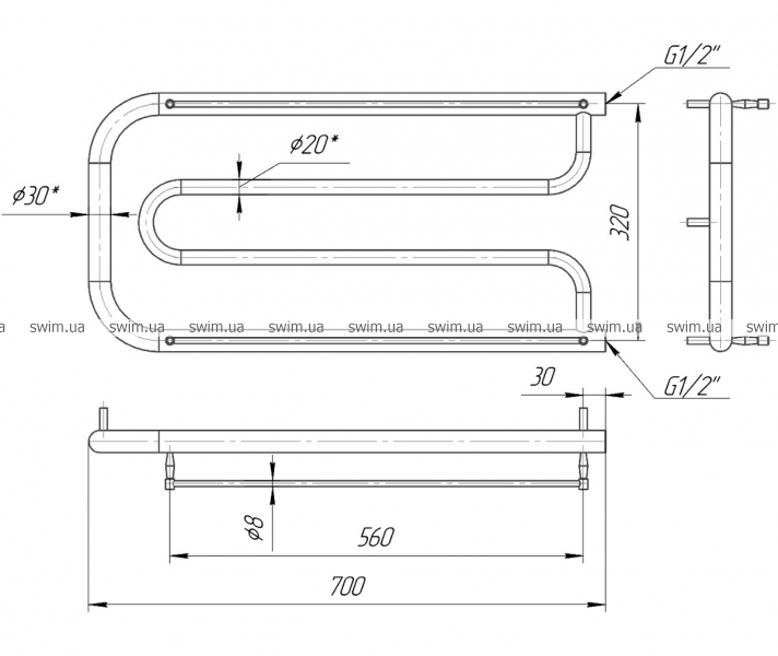 Водяной полотенцесушитель Фокстрот 350х700 с межосевым расстоянием для подключения 320 мм, диаметр подключения G 1/2'' состоит из 1 гиба ребер. Полотенцесушитель Фокстрот производственного предприятия Mario изготовлен из нержавеющей стали АІSI 304.