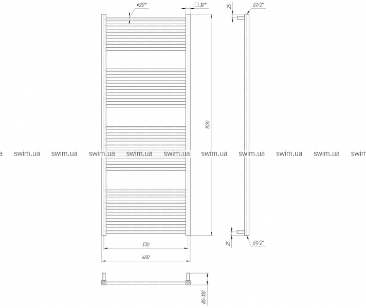 Водяной полотенцесушитель Гера 1500х570 с межосевым расстоянием для подключения 570 мм, диаметр подключения G 1/2'' состоит из 29 ребер. Полотенцесушитель Гера производственного предприятия Mario изготовлен из нержавеющей стали АІSI 304 может быть оборудован 600W электрическим теном.