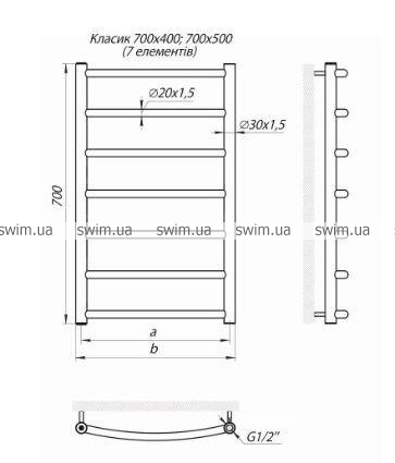 Водяной полотенцесушитель Классик 500х400 с межосевым растоянием для подключения 400мм, диметр подключения G 1/2'' состоит из 5 ребер. Полотенцесушитель Классик производсветнного предприятия Mario изготовлен из нержавеющей стали АІSI 304 может быть оборудован 300W электрическим теном.