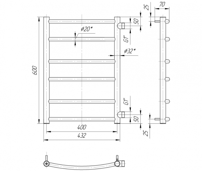 Водяной полотенцесушитель Классик Б/П 1" 600х400 с межосевым расстоянием для подключения 400мм, диаметр подключения G 1'' состоит из 6 ребер. Полотенцесушитель Классик Б/П 1" производственного предприятия Mario изготовлен из нержавеющей стали АІSI 304.