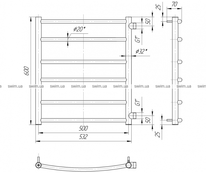 Водяной полотенцесушитель Классик Б/П 1" 600х500 с межосевым расстоянием для подключения 500мм, диаметр подключения G 1'' состоит из 6 ребер. Полотенцесушитель Классик Б/П 1" производственного предприятия Mario изготовлен из нержавеющей стали АІSI 304.