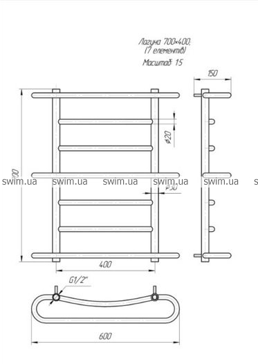 Водяной полотенцесушитель Лагуна 700х600 с межосевым расстоянием для подключения 400 мм, диаметр подключения G 1/2'' состоит из 7 ребер. Полотенцесушитель Лагуна производственного предприятия Mario изготовлен из нержавеющей стали АІSI 304 может быть оборудован 300W электрическим теном.