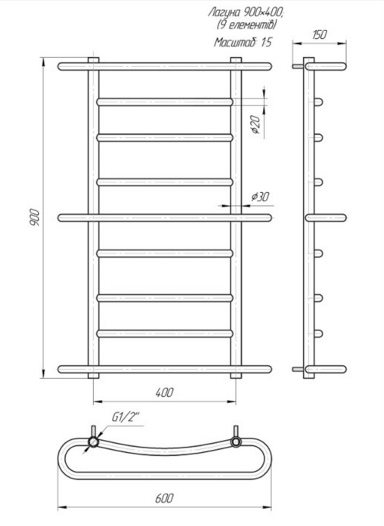Водяной полотенцесушитель Лагуна 900х600 с межосевым расстоянием для подключения 400 мм, диаметр подключения G 1/2'' состоит из 9 ребер. Полотенцесушитель Лагуна производственного предприятия Mario изготовлен из нержавеющей стали АІSI 304 может быть оборудован 300W электрическим теном.