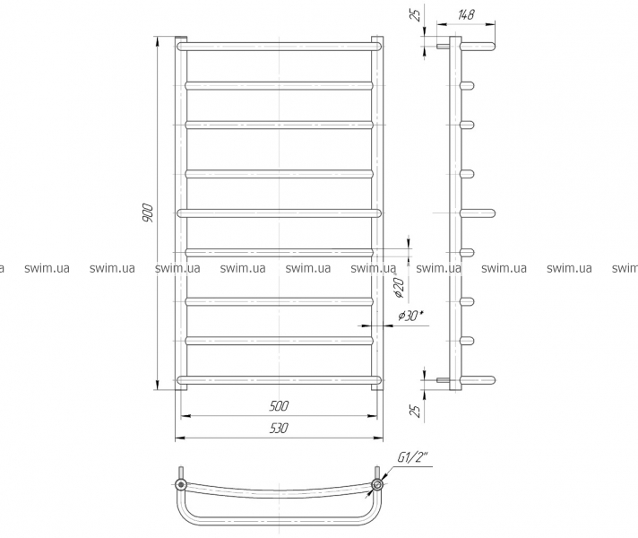 Водяной полотенцесушитель Люкс 900х500 с межосевым расстоянием для подключения 500 мм, диаметр подключения G 1/2'' состоит из 9 ребер. Полотенцесушитель Люкс производственного предприятия Mario изготовлен из нержавеющей стали АІSI 304 может быть оборудован 300W электрическим теном.