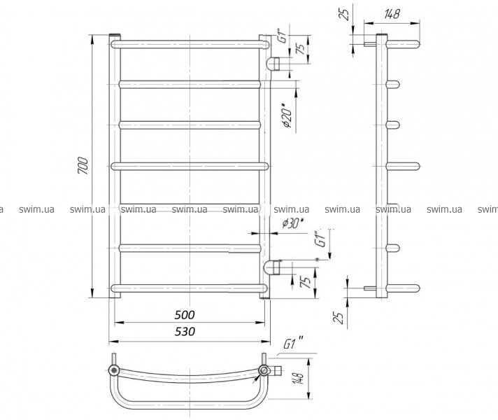 Водяной полотенцесушитель Люкс Б/П 1" 700х500 с межосевым расстоянием для подключения 500мм, диаметр подключения G 1'' состоит из 7 ребер. Полотенцесушитель Люкс Б/П 1" производственного предприятия Mario изготовлен из нержавеющей стали АІSI 304.