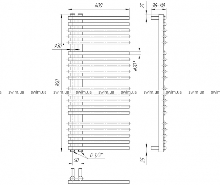 Водяной полотенцесушитель Премиум Марсель 900x400 с межосевым расстоянием для подключения 50 мм, диаметр подключения G 1/2'' состоит из 20 ребер. Полотенцесушитель Премиум Марсель производственного предприятия Mario изготовлен из нержавеющей стали АІSI 304 может быть оборудован 300W электрическим теном.