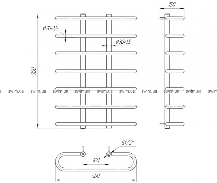 Водяной полотенцесушитель Саxара 700х500 с межосевым расстоянием для подключения 160 мм, диаметр подключения G 1/2'' состоит из 7 ребер. Полотенцесушитель Сахара производственного предприятия Mario изготовлен из нержавеющей стали АІSI 304 может быть оборудован 300W электрическим теном.