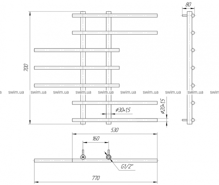 Водяной полотенцесушитель Симфония 700х530 с межосевым расстоянием для подключения 160 мм, диаметр подключения G 1/2'' состоит из 7 ребер. Полотенцесушитель Симфония производственного предприятия Mario изготовлен из нержавеющей стали АІSI 304 может быть оборудован 300W электрическим теном.