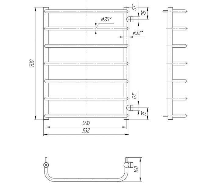 Водяной полотенцесушитель Стандарт Б/П 1" 700х550 с межосевым расстоянием для подключения 500мм, диаметр подключения G 1/2'' состоит из 7 ребер. Полотенцесушитель Стандарт Б/П 1" производственного предприятия Mario изготовлен из нержавеющей стали АІSI 304.