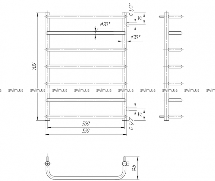 Водяной полотенцесушитель Стандарт Б/П 1/2" 700х500 с межосевым расстоянием для подключения 500мм, диаметр подключения G 1/2'' состоит из 7 ребер. Полотенцесушитель Стандарт Б/П 1/2" производственного предприятия Mario изготовлен из нержавеющей стали АІSI 304.