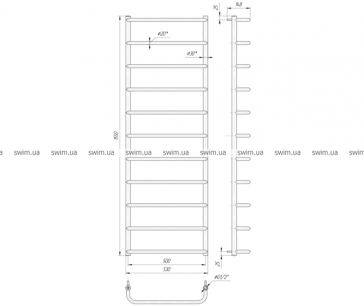 Водяной полотенцесушитель Стандарт HP 1550х530 с межосевым расстоянием для подключения 500 мм, диаметр подключения G 1/2'' состоит из 11 ребер. Полотенцесушитель Стандарт HP производственного предприятия Mario изготовлен из нержавеющей стали АІSI 304 может быть оборудован 300W электрическим теном.