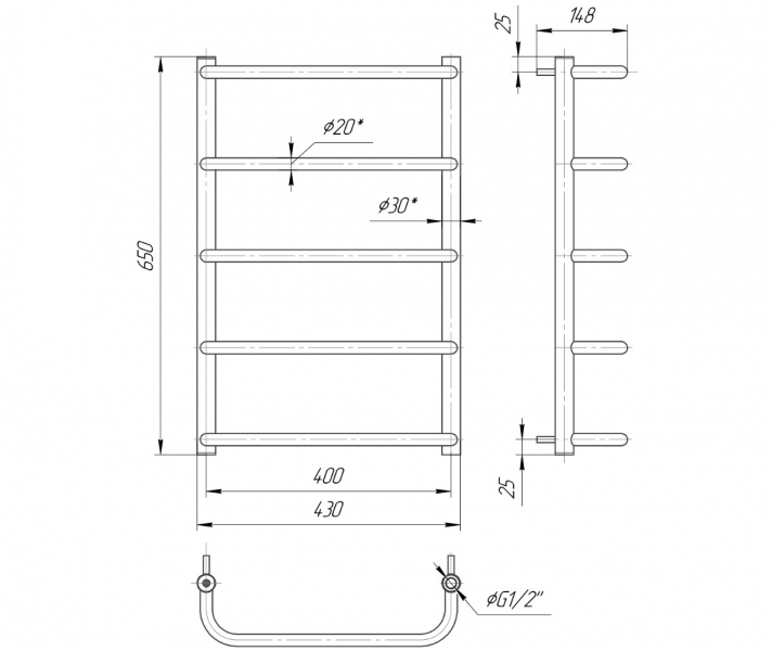 Водяной полотенцесушитель Стандарт HP 650х430 с межосевым расстоянием для подключения 400 мм, диаметр подключения G 1/2'' состоит из 5 ребер. Полотенцесушитель Стандарт HP производственного предприятия Mario изготовлен из нержавеющей стали АІSI 304 может быть оборудован 100W электрическим теном.