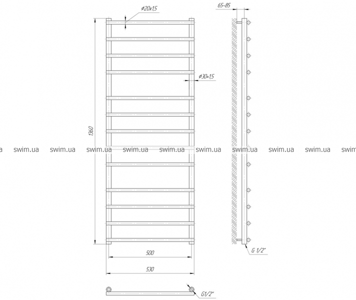 Водяной полотенцесушитель Турин 1360х500 с межосевым расстоянием для подключения 500 мм, диаметр подключения G 1/2'' состоит из 13 ребер. Полотенцесушитель Турин производственного предприятия Mario изготовлен из нержавеющей стали АІSI 304 может быть оборудован 600W электрическим теном.
