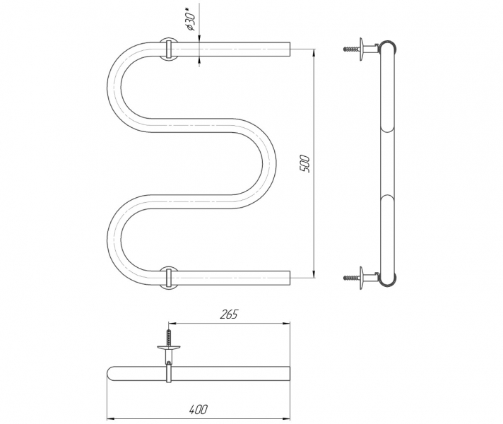Водяной полотенцесушитель Змейка ∅30 500х400 с межосевым расстоянием для подключения 500 мм, диаметр подключения G 1/2'' состоит из 4 ребер, 3 гиба. Полотенцесушитель Змейка 30 с боковым подключением производиться на нашем предприятии Марио с 1998 года.