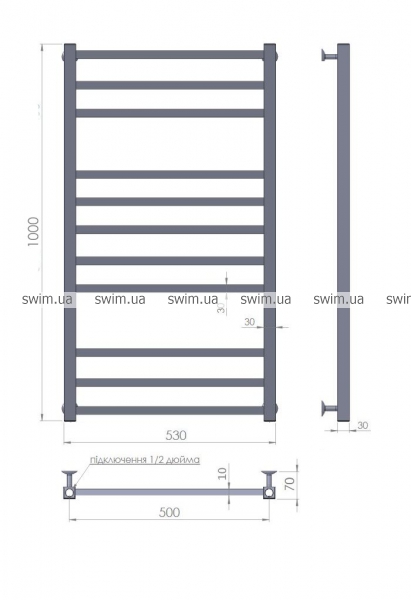 - Ширина 530-630 мм, Глубина 70 мм, Высота 800-1000-1200 мм.
