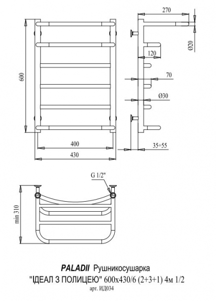 Полотенцесушитель водяной Paladii Идеал с полкой ИД034 600х430 мм