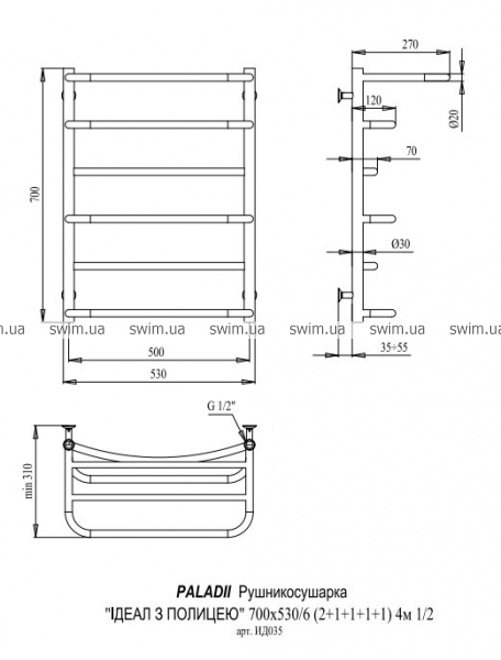 ГоловнаСушки для рушниківPaladii → Полотенцесушитель водяной Paladii Идеал с полкой ИД035 700х530 мм