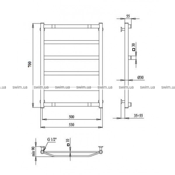 - Ширина 500-530-630 мм, Глубина 90 мм, Высота 700-850-1000-1200 мм.