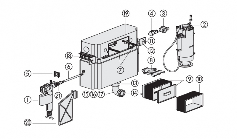 Прижим к смывным бачкам Sanit 983N, CC-150-S-FO-2V-2C и CC-150-S-UO-2V-2C для скрытого монтажа с малым ревизионным отверстием