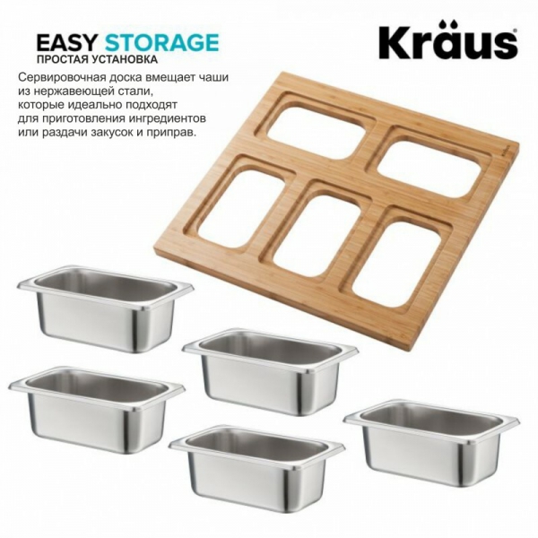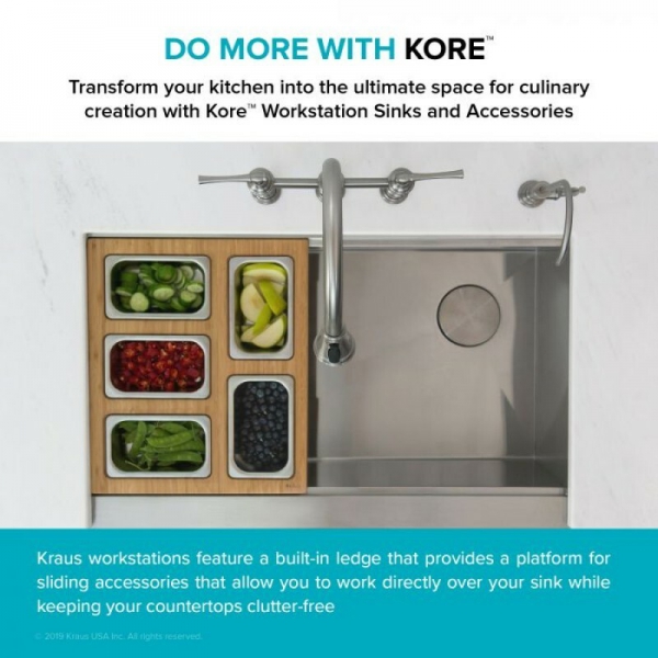 Превратите вашу мойку KRAUS Workstation в оптимальное место для приготовления и презентаций блюд с помощью индивидуально подобранной сервировочной доски, которая скользит по интегрированному бортику.