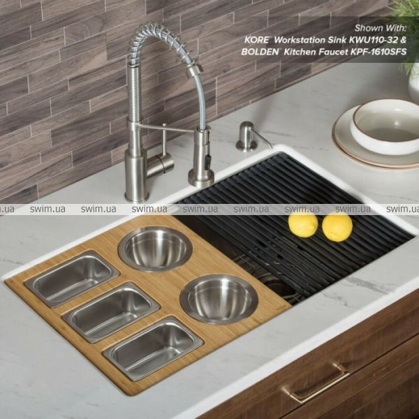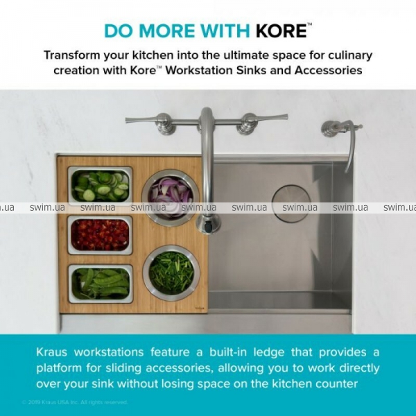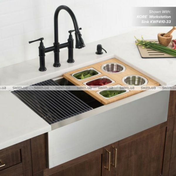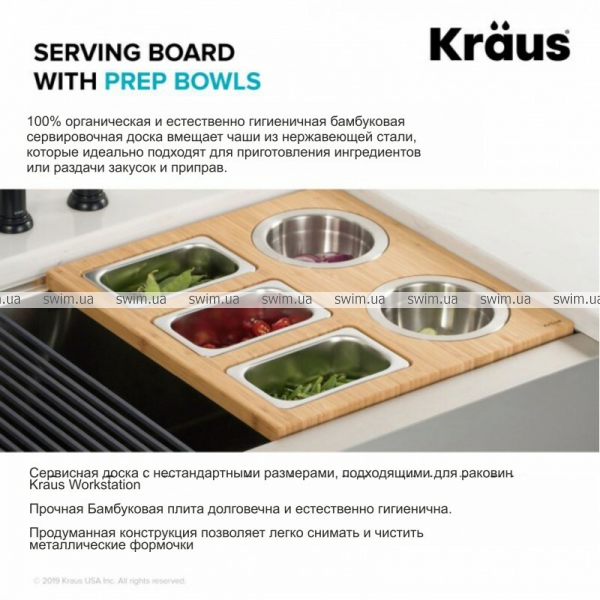 Превратите вашу мойку KRAUS Workstation в оптимальное место для приготовления и презентаций блюд с помощью индивидуально подобранной сервировочной доски, которая скользит по интегрированному бортику.
