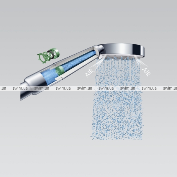 - тип струи: RainAir (дождевая струя, обогащенная воздухом), WhirlAir (массажная струя), BalanceAir (смешанная струя)