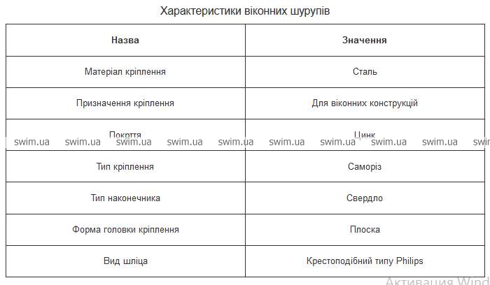 Шуруп віконний має потаємну головку з насічки, повне різьблення з частим кроком по всій довжині стрижня шурупа, що закінчується свердлом (буром). Призначений для надійного кріплення елементів віконних конструкцій та дверей.