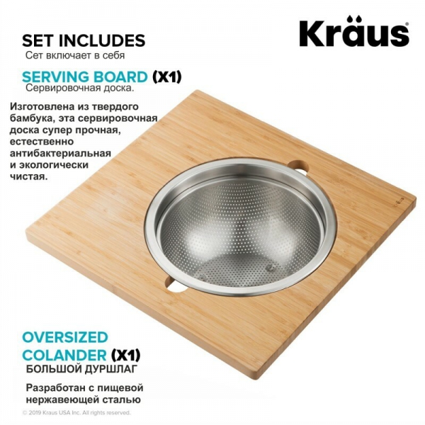 Превратите вашу мойку KRAUS Workstation в оптимальное место для приготовления и презентаций блюд с помощью индивидуально подобранной сервировочной доски, которая скользит по интегрированному бортику.
