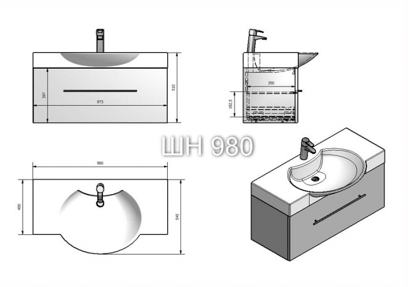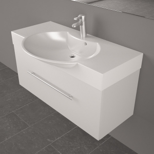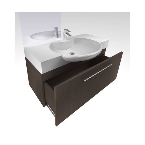 Підвісна шафка довжиною 98 см виконана в класичному стилі з великим, висувним ящиком на доводчиках, в якому можна використовувати одну велику білизну. Особливу увагу хочеться приділити умивальнику зі штучного каменю, який вдало доповнює та перетворює комплект. Умивальник має чашу округлої форми, яка хвилює вперед, дозволяє зручно вмиватися, нахиляючись над ним і при цьому не розбризкуючи воду навколо. Два великі крила навколо чаші умивальника дають можливість переслати на них усі необхідні засоби масової інформації.