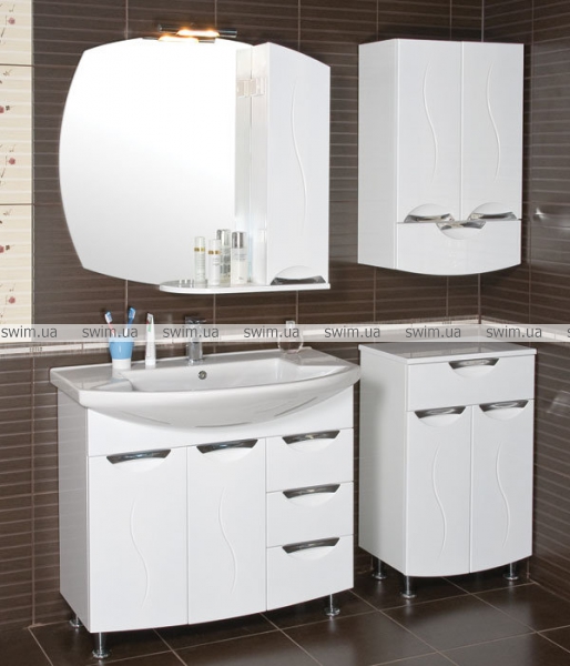 Интересным элементом коллекции является угловая мебель: угловой пенал и угловой навесной шкаф. Они будут особенно уместны в малогабаритных ванных комнатах. То же можно сказать и о навесном шкафчике с дверкой-зеркалом.