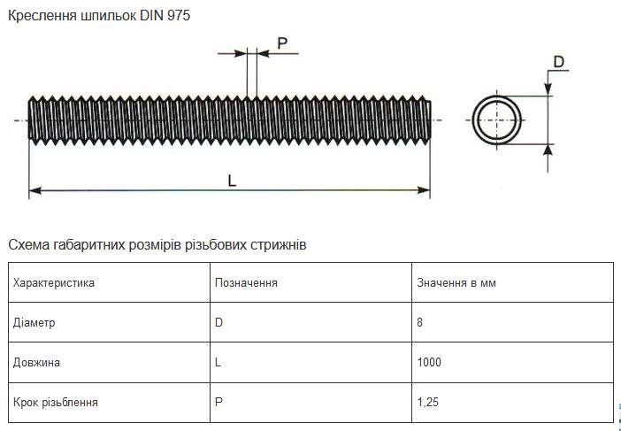 Шпилька DIN 975 є металевим стрижнем, повністю покритим різьбленням. Виріб виготовляється зі сталі та оцинковується для захисту від корозії. Клас міцності кріплення -4.8. Різьбові шпильки використовуються разом з гайками та шайбами аналогічного діаметру.