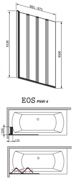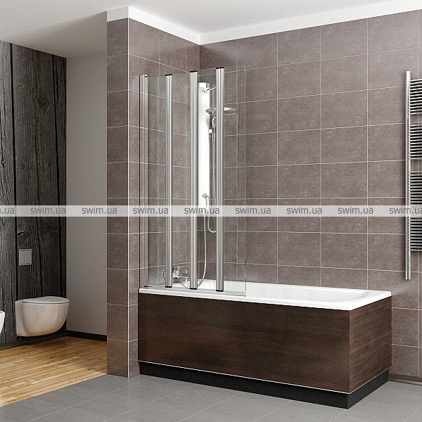 Состоит из 4 элементов. Складывается гармошкой во внутрь ванны. В сложенном виде шторка занимает только 22 см. Благодаря этому ее можно монтировать на стене на которой находиться смеситель.