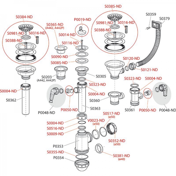 - Возможность подключения сливной трубы Ø50 мм или Ø40 мм