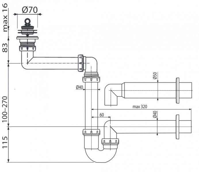 A870-DN40 СИФОН ДЛЯ МОЙКИ ЭКОНОМЯЩИЙ ПРОСТРАНСТВО БЕЗ ШТУЦЕРА