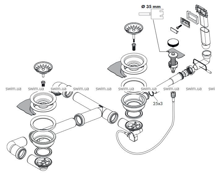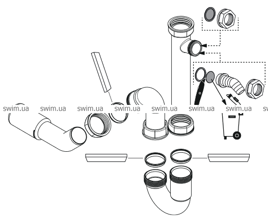 - состоит из: комплекта стока и перелива, корзины-сита для стока, сифона, набора для автоматического слива