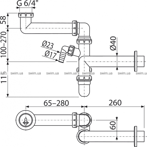 Сифон для мийки, що економить простір, з штуцером та з накидною гайкою 6/4"
