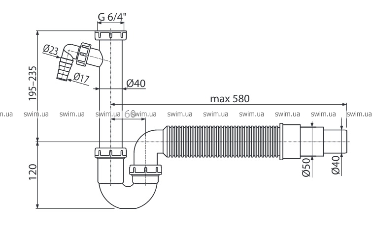 A83-DN50/40 СИФОН ТРУБЧАТЫЙ С НАКИДНОЙ ГАЙКОЙ 6/4", ПОДВОДКОЙ (ШТУЦЕРОМ) И ГОФРОЙ