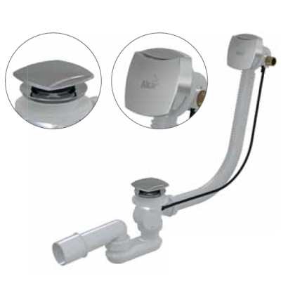 Весь производственный ряд сифонов фирмы Alca plast использует материалы, стойкие к воздействию высоких температур и всех обычно используемых чистящих средств. Материалы уплотнений наряду с конструкционным исполнением отличаются высокими плотностью и стойкостью к чистящим средствам. В результате решения формы сифонов достигаются высокие величины потока (с запасом превышается поток, установленный стандартами), а в результате решения внутренних форм эффективно снижается засорение. Классические классические сифоны для ванн т.е с пробкой на цепочке. Пробка изготовлена из резины, а решетка для пробки из полированного нержавеющего листового металла. Решетка перелива может быть выполнена из белой пластмассы или хромирована. Управляемые управление пробкой сифона с помощью кнопки, закрывающей перелив. Кнопка управления может быть изготовленна из белой или хромированной пластмассы или из медного хромированного сплава. Пробка, в зависимости от комбинации с кнопкой управления, пластмассовая с металлической хромированной крышкой или полностью металлическая выполненная из хромированной латуни. Пробка может быть изготовленна в варианте с крышкой (типа грибок), полностью закрывающей решетку. Поставляются варианты длиной 600-1200 мм.